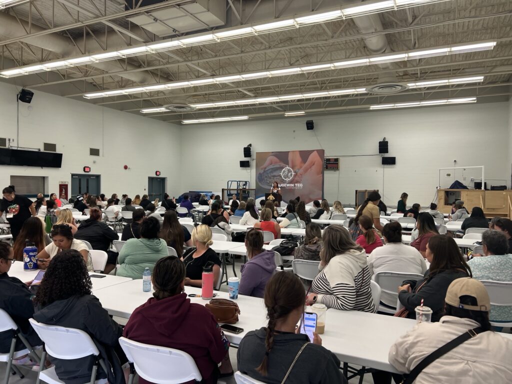 Following the keynote, participants engaged in three different workshop rotations: ‘Inoojiinhs Ntam Gaashkibijigan (Baby’s First Bundle’) with Laurie McLeod-Shabogesic, ‘Spirit’s Journey’ with Dan Garcia, ‘3 M’s of My Learning’ with Ninaatig Staats Pangowish.