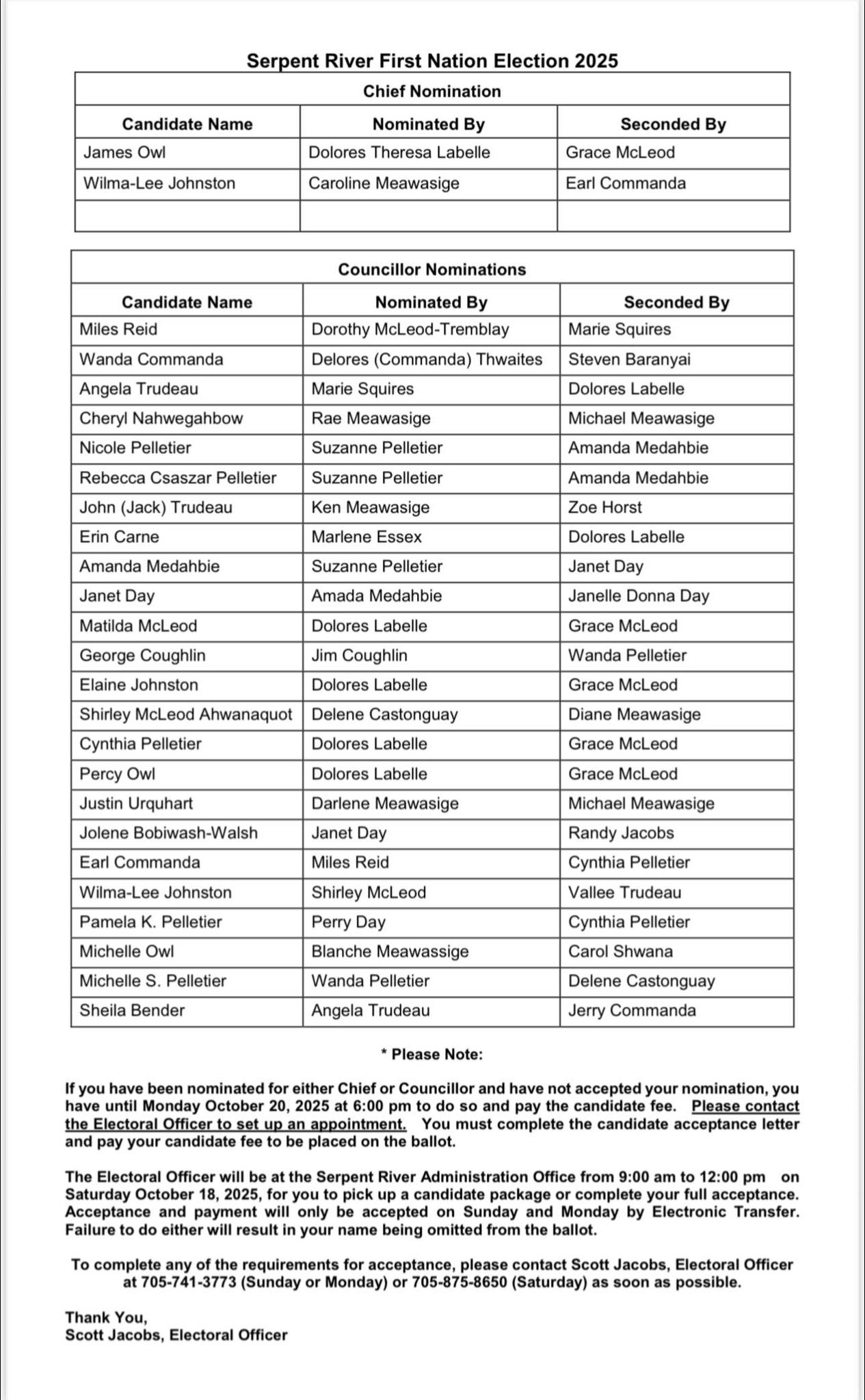 By Rosalind Russell – Any band member of Serpent River First Nation has until six pm this evening to have their nomination in place for the election of Chief and Council.Electoral Officer Scott Jacobs says so far there are two … Continue reading