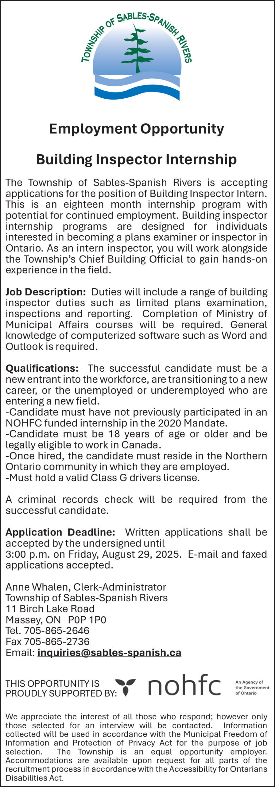 Employment Opportunity – Township of Sables Spanish Rivers – Building Inspector Internship