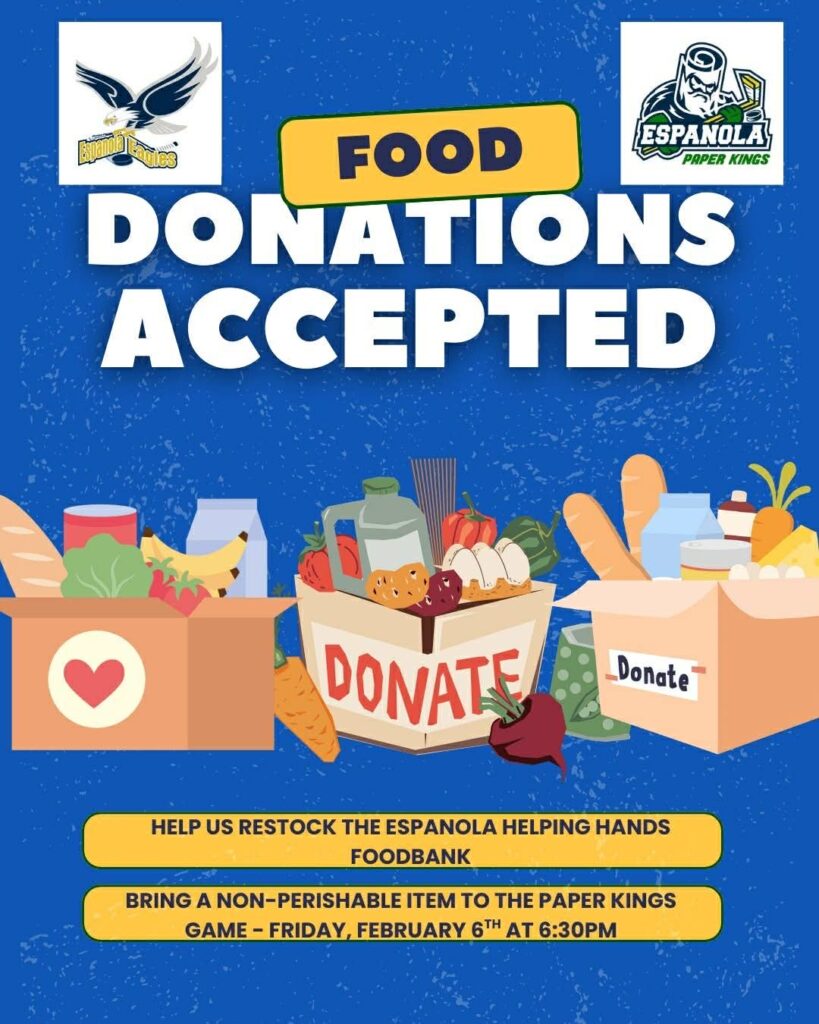 The Kings, in partnership with Espanola Minor Hockey, are asking fans to bring non-perishable items to donate to the Espanola Helping Hand Food Bank.