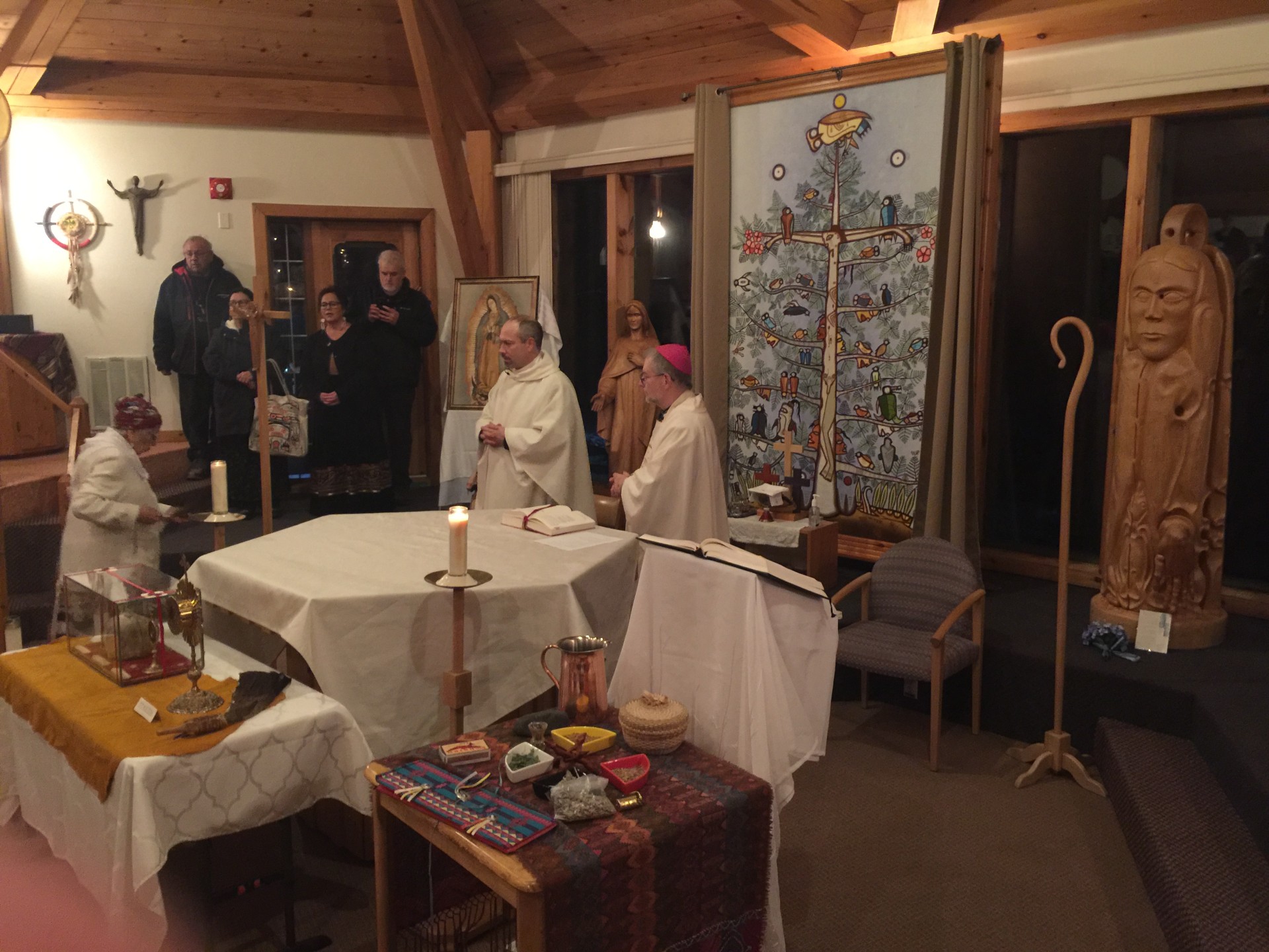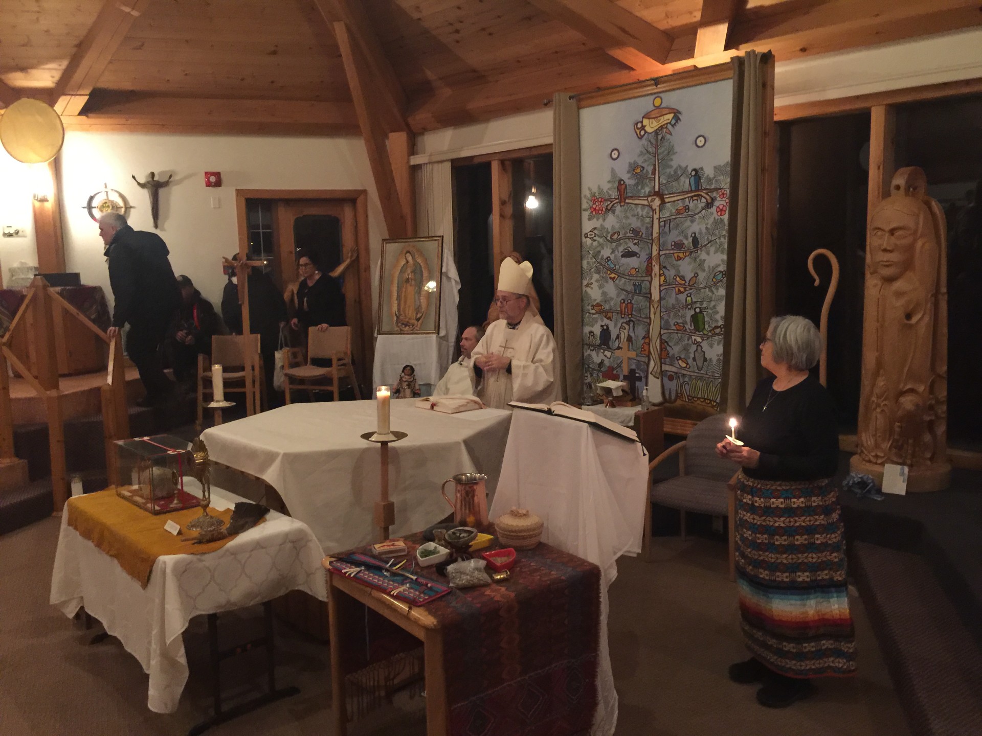 Bishop Thomas Dowd of the Diocese of Sault Ste. Marie officiated the Mass and Veneration of the Relics with Father John O’Brian and the Indigenous ceremonials were hosted by Wiikwemkoong Elder and Centre Board Chair, Rosella Kinoshameg.