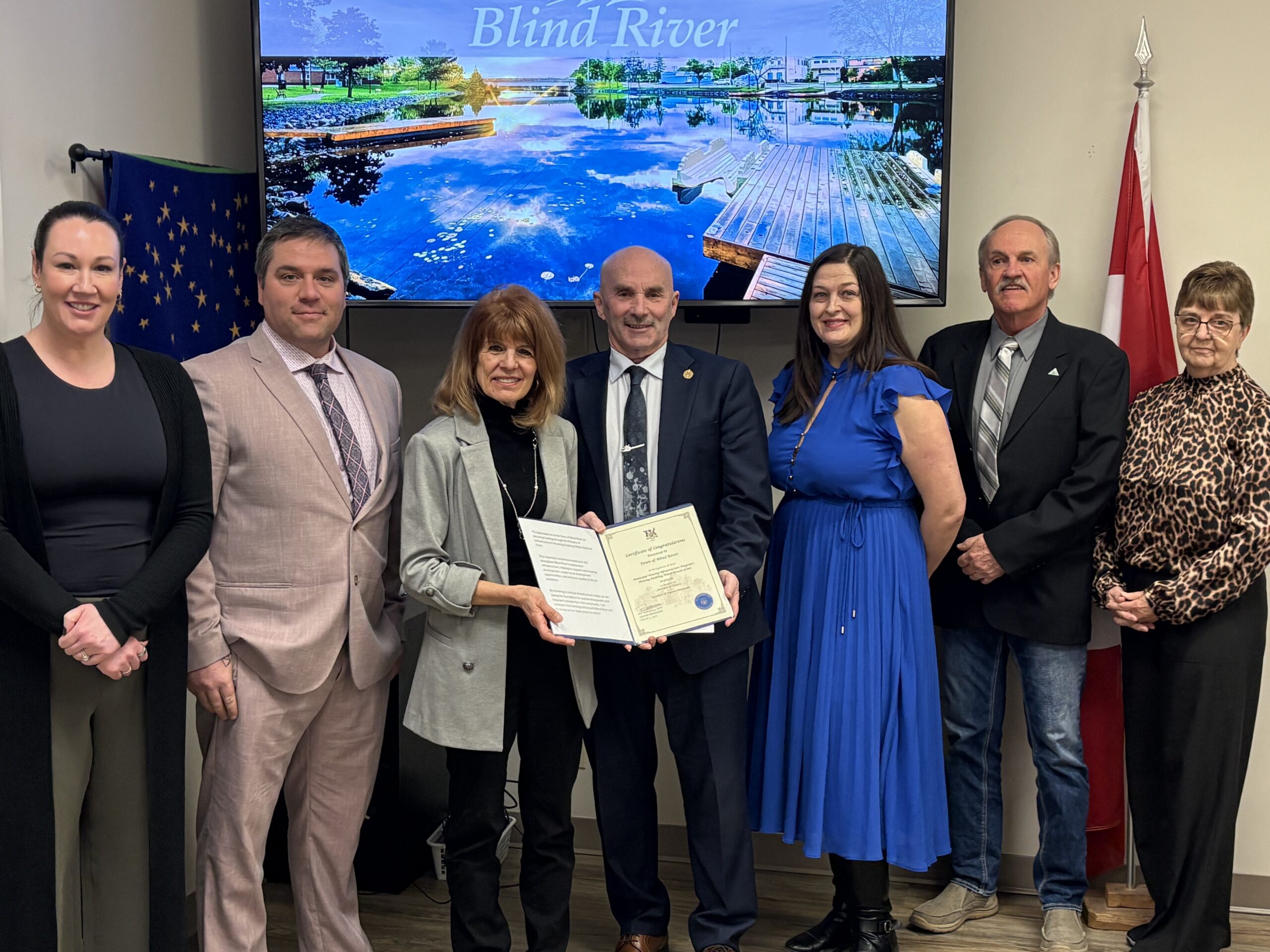 Blind River: Councillors Katie Whitlock, Dan Middaugh, Mayor Sally Hagman, MPP Bill Rosenberg, Councillors Jennifer Posteraro, Jim Dunbar, Betty Ann Dunbar