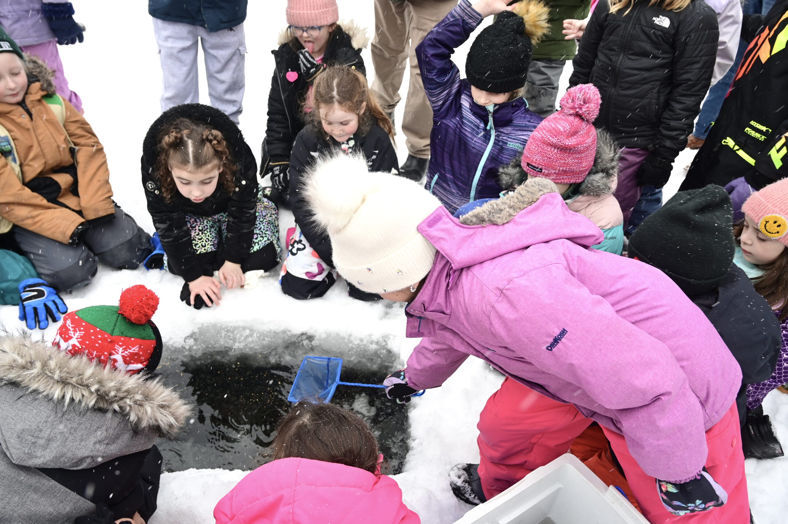 For the fry release, students joined staff and partners from Sudbury Fish and Game and Atikameksheng Anishnawbek, who organized the event and offered tobacco and a prayer before releasing the fry into the water.