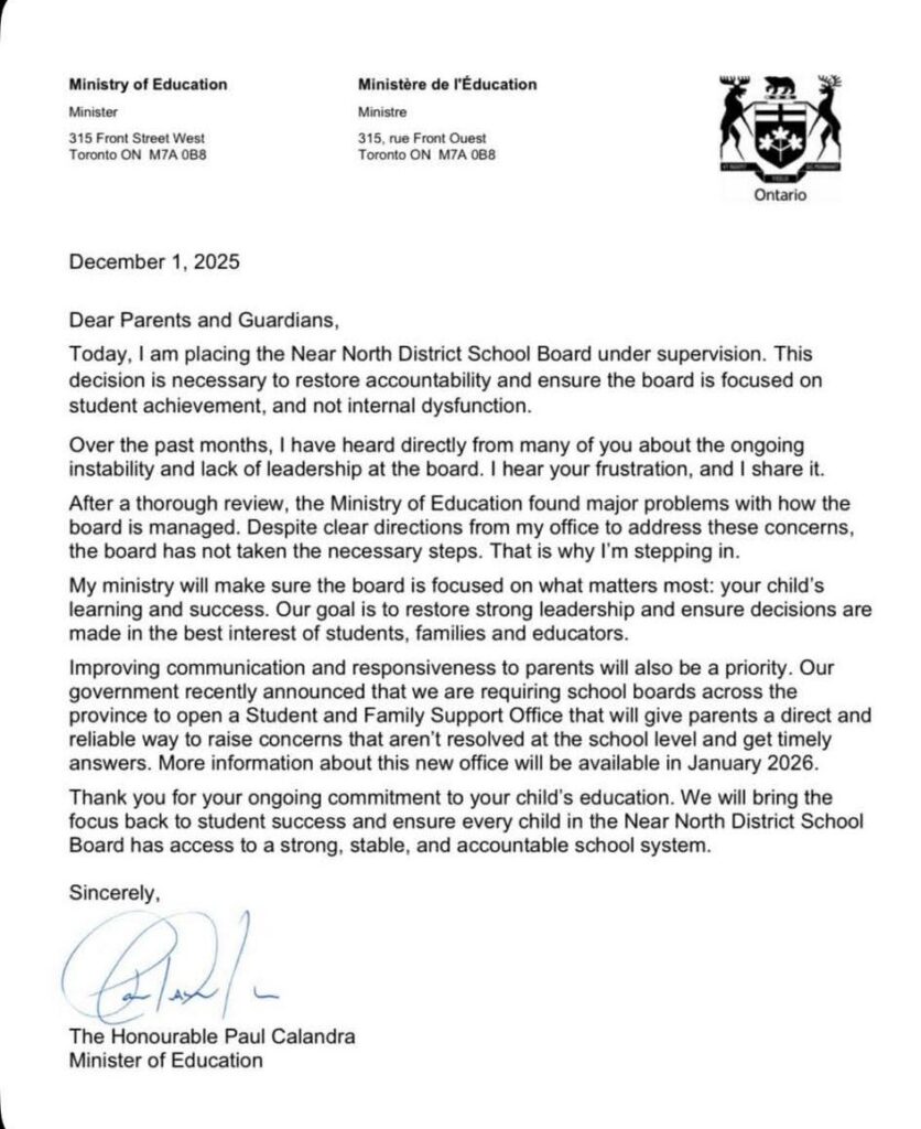 Yesterday morning (Mon), Education Minister Paul Calandra announced the Near North Board – which stretches from North Bay to Parry Sound — is the latest to be taken over.