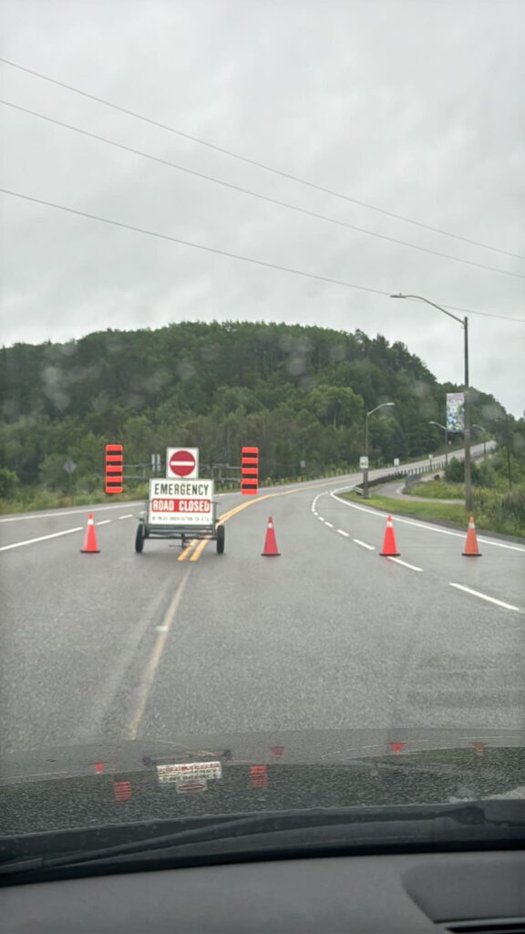 Emergency services have been notified, and “Road Closed” signs and barricades have been erected at sites.