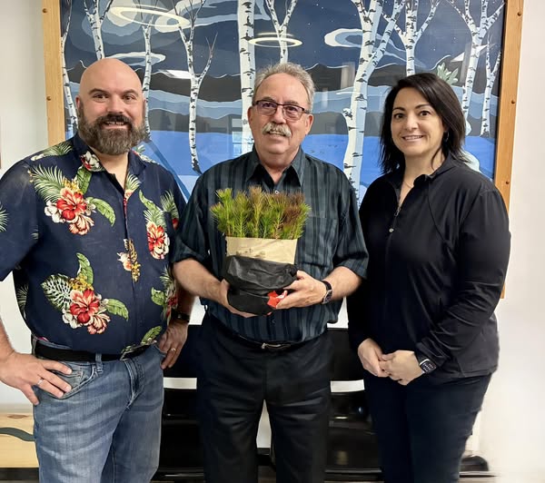 - Espanola High School teacher Jayson Stewart (left) and principal Andrea Therrien (right) present a bundle of fifty seedlings to Sables-Spanish Rivers Mayor and Spartan alumnus Kevin Burke as part of the LaCloche Tree Planting Relay. Photo provided.